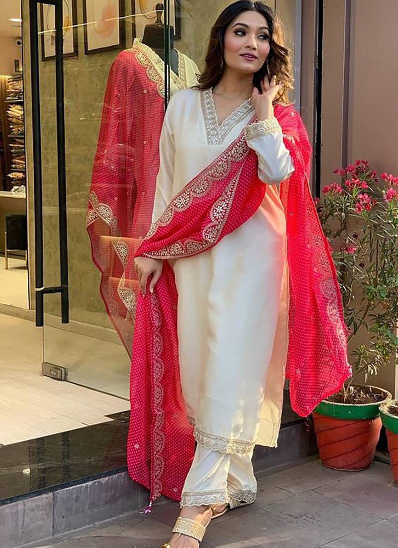 A off white beauty adorned with intricate embroidery , this viscose fabric kurta pant set is a festive dream come true. The dots printed chanderi dupatta adds a touch of traditional elegance, while the delicate moti and cut dana work on the neckline create a stunning focal point, this kurti comes with a plain back kurta. This outfit is perfect for celebrating the festive season in style.