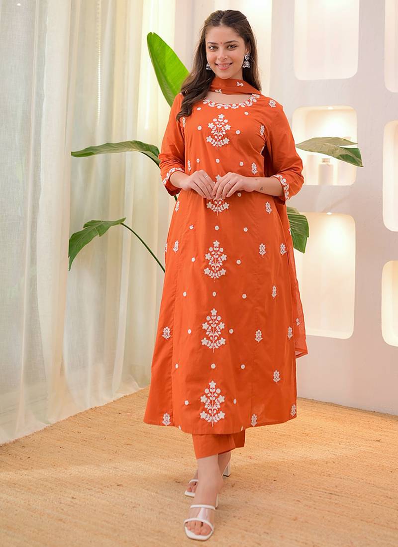 • Product Id : 4708959 • Package Details : 1 Top / 1 Bottom / 1 Dupatta • Type : Kurta Sets • Work : Embroidered • Type : Thread Work • Look : Designer • Sleeve : Quarter Sleeve • Neck Style : Round Neck • Color : Orange • Fabric : Faux Rayon • Stitching : Stitched Payments [+]