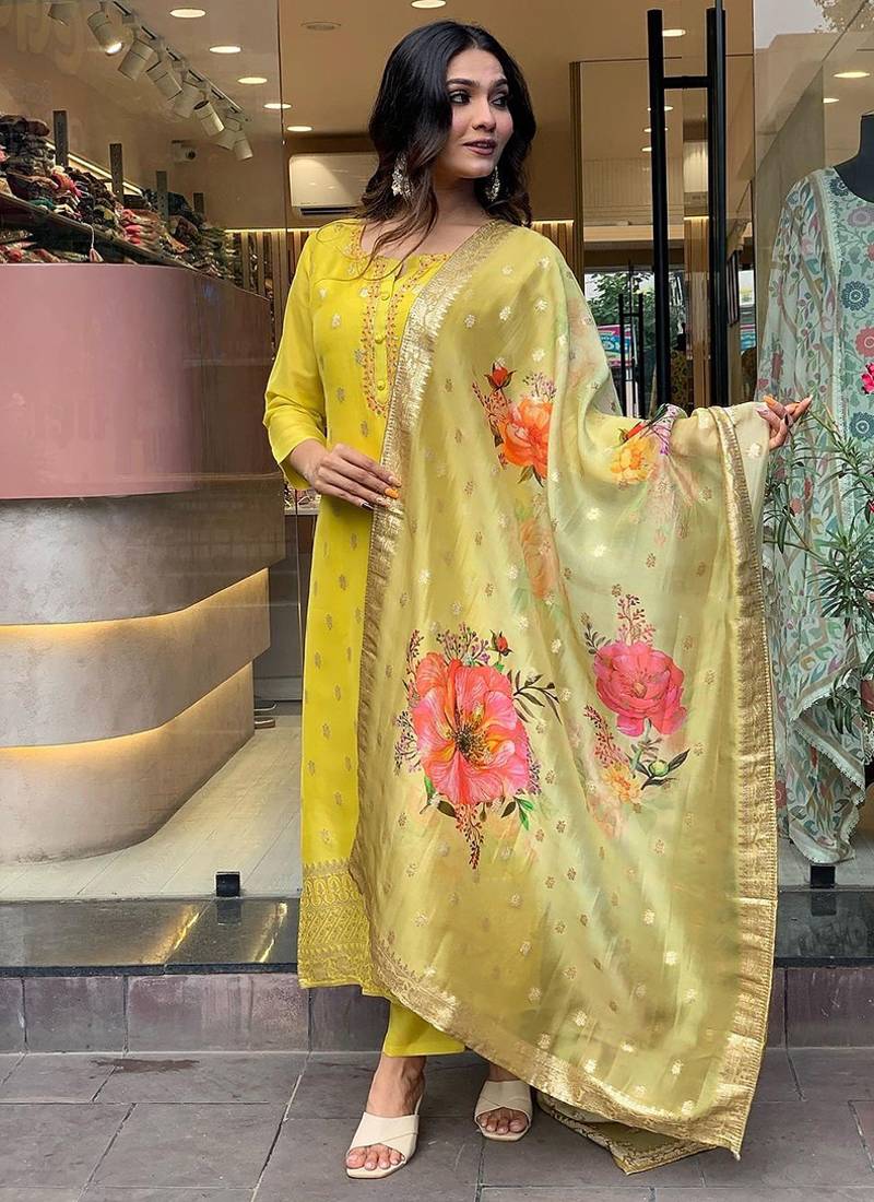 This yellow kurta set in organza jacquard fabric exudes quiet elegance, making it a timeless pick for festive gatherings. The kurta is paired with matching straight pants and a jaquard dupatta
