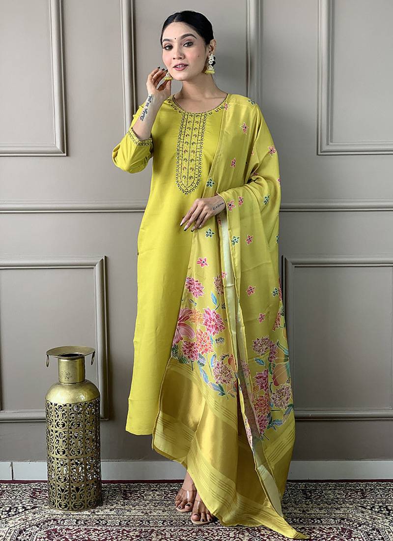 • Product Id : 4699411 • Package Details : 1 Top / 1 Bottom / 1 Dupatta • Type : Kurta Sets • Work : Embroidered • Type : Zari Work • Look : Designer • Sleeve : Elbow Sleeve • Neck Style : Round Neck • Color : Parrot Green • Fabric : Faux Chanderi • Stitching : Stitched Payments [+]