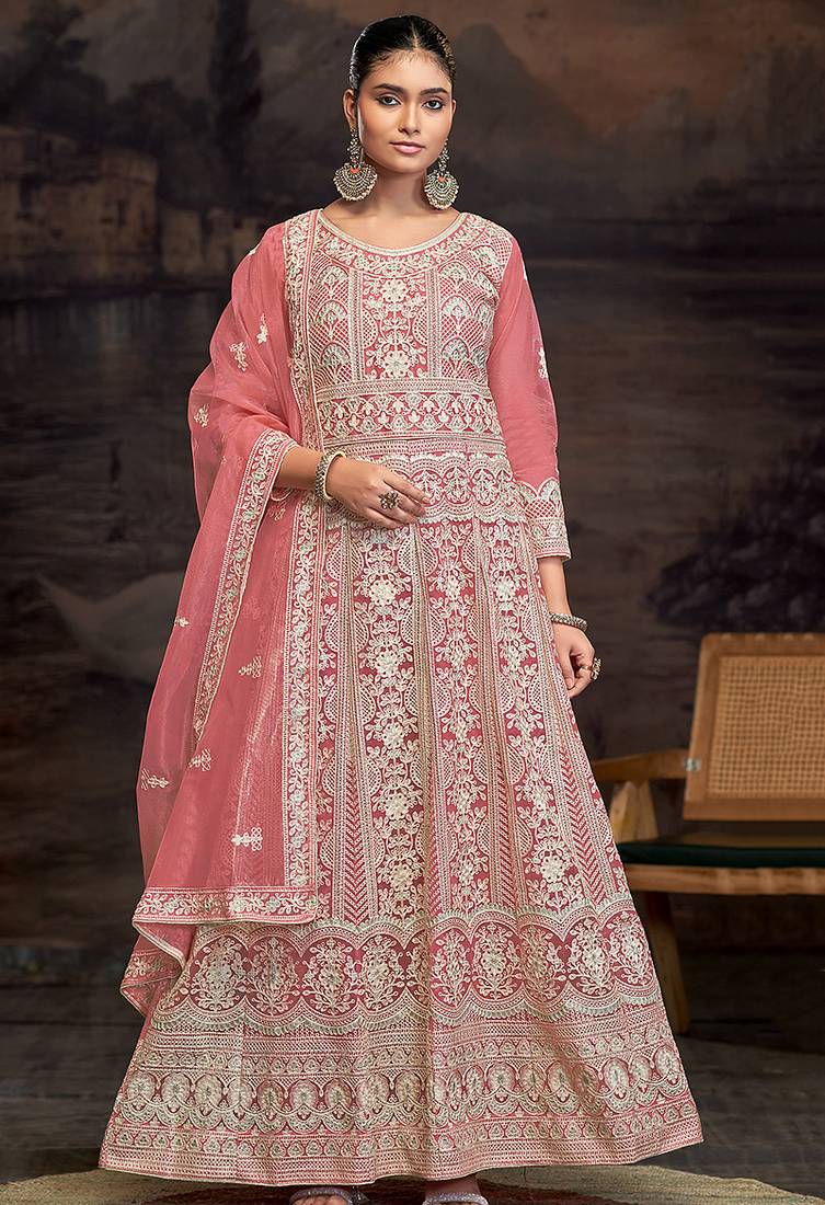 Fantastic craftmanship of embellishments exhibited in this peach net anarkali salwar kameez. The embroidered work looks chic and ideal for any function. Comes with matching bottom and dupatta. (Slight variation in color, fabric & work is possible. Model images are only representative.)