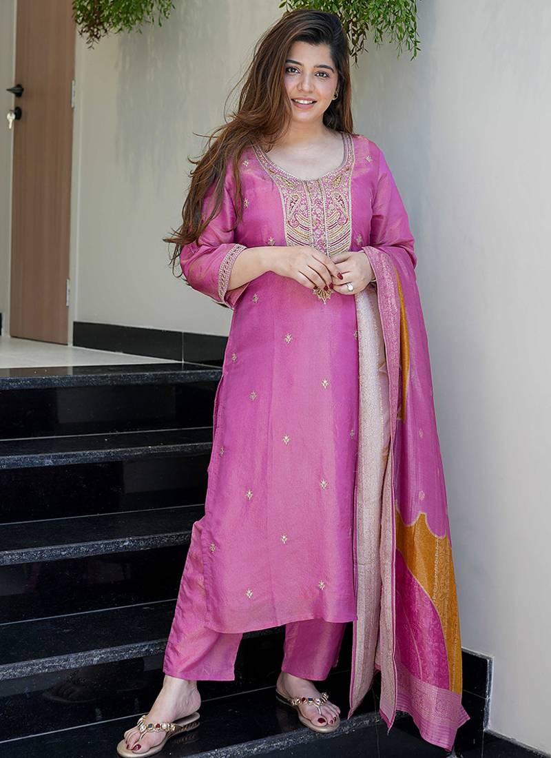 • Product Id : 4705946 • Package Details : 1 Top / 1 Bottom / 1 Dupatta • Type : Kurta Sets • Work : Embroidered • Type : Zari Work • Look : Designer • Sleeve : Quarter Sleeve • Neck Style : Round Neck • Fabric : Viscose • Color : Pink • Stitching : Stitched Payments [+]