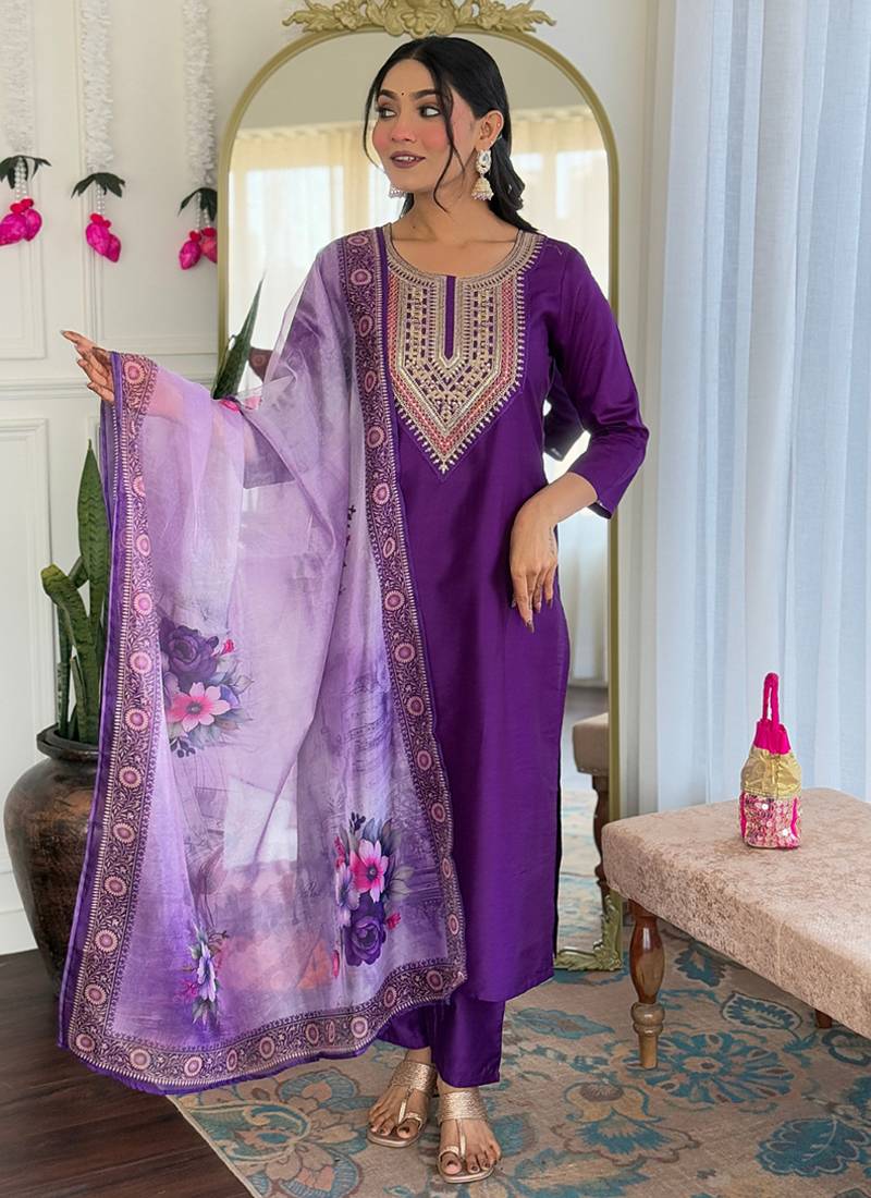 • Product Id : 4705962 • Package Details : 1 Top / 1 Bottom / 1 Dupatta • Type : Kurta Sets • Occasion : Ceremonial • Work : Embroidered • Type : Thread Work • Look : Designer • Sleeve : Quarter Sleeve • Neck Style : Round Neck • Color : Purple • Fabric : Faux Rayon • Stitching : Stitched Payments [+]