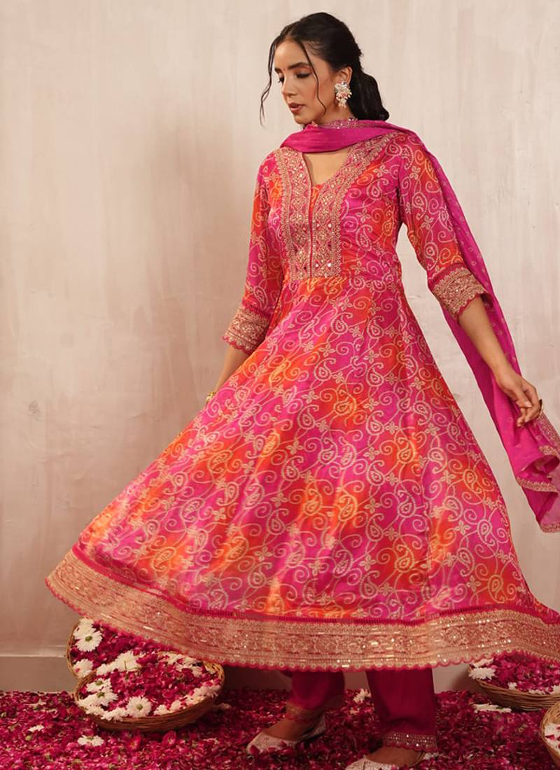 Rani Pink Chinon Silk Bandhani Print Ready Made Kurta Set Stitched