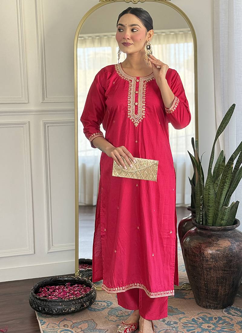 Rani Pink Color Chanderi Viscose Embroidered Kurta Set Stitched