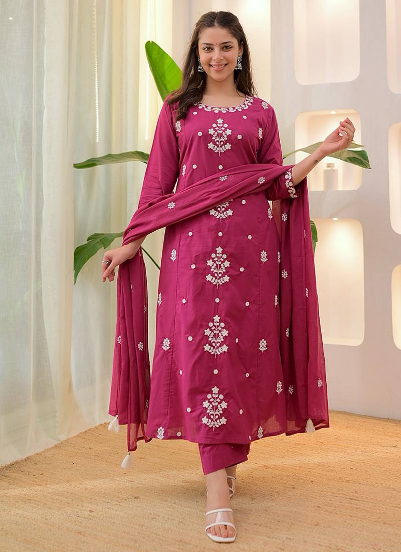 • Product Id : 4708958 • Package Details : 1 Top / 1 Bottom / 1 Dupatta • Type : Kurta Sets • Work : Embroidered • Type : Thread Work • Look : Designer • Sleeve : Quarter Sleeve • Neck Style : Round Neck • Color : Rani Pink • Fabric : Faux Rayon • Stitching : Stitched Payments [+]