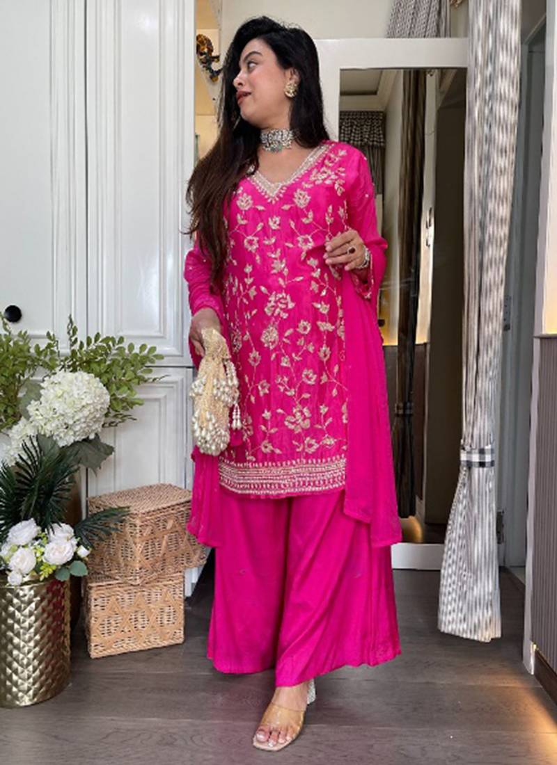 Rani Pink Embroidered Chinon Eid Palazzo Suit Stitched