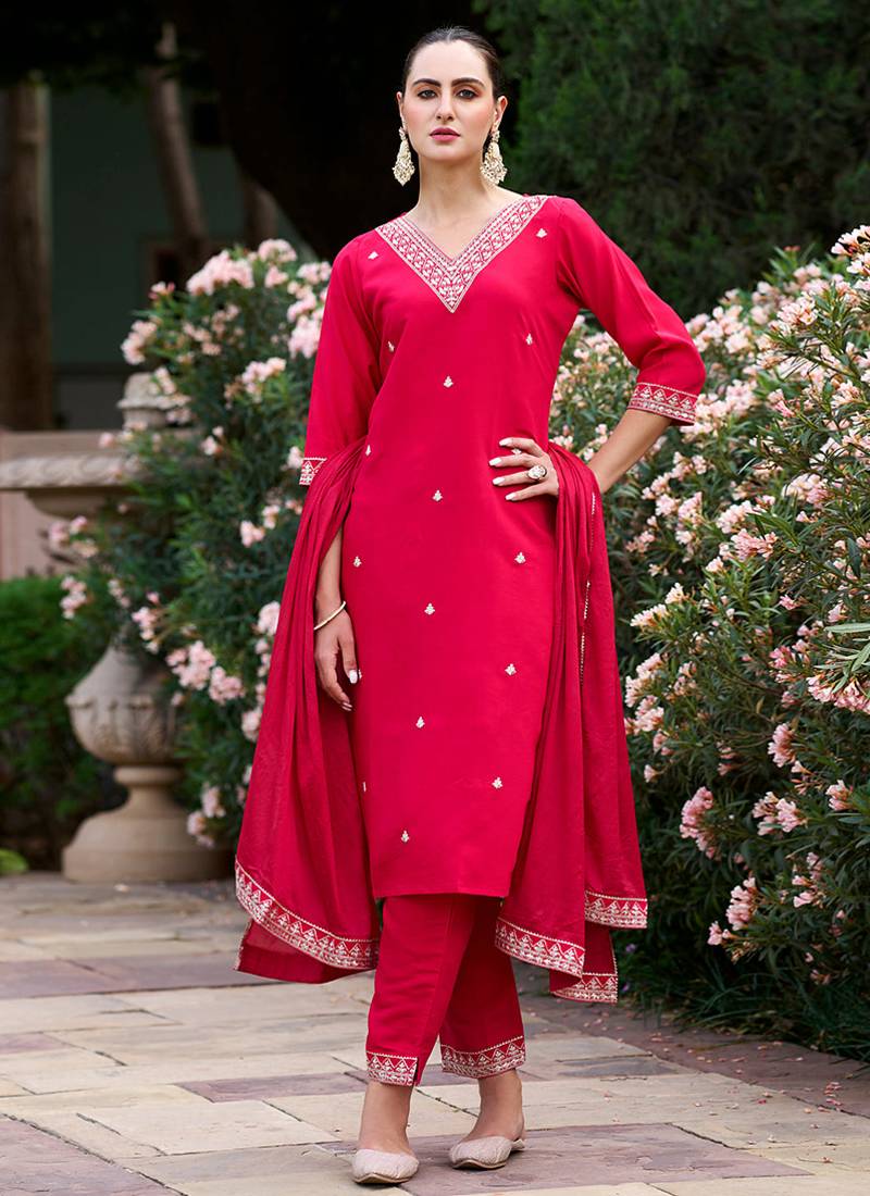 A vibrant Rani Pink color Rayon top set with embroidered work, styled with Chinon dupatta. A strong color-pop festive option with minimal fuss.