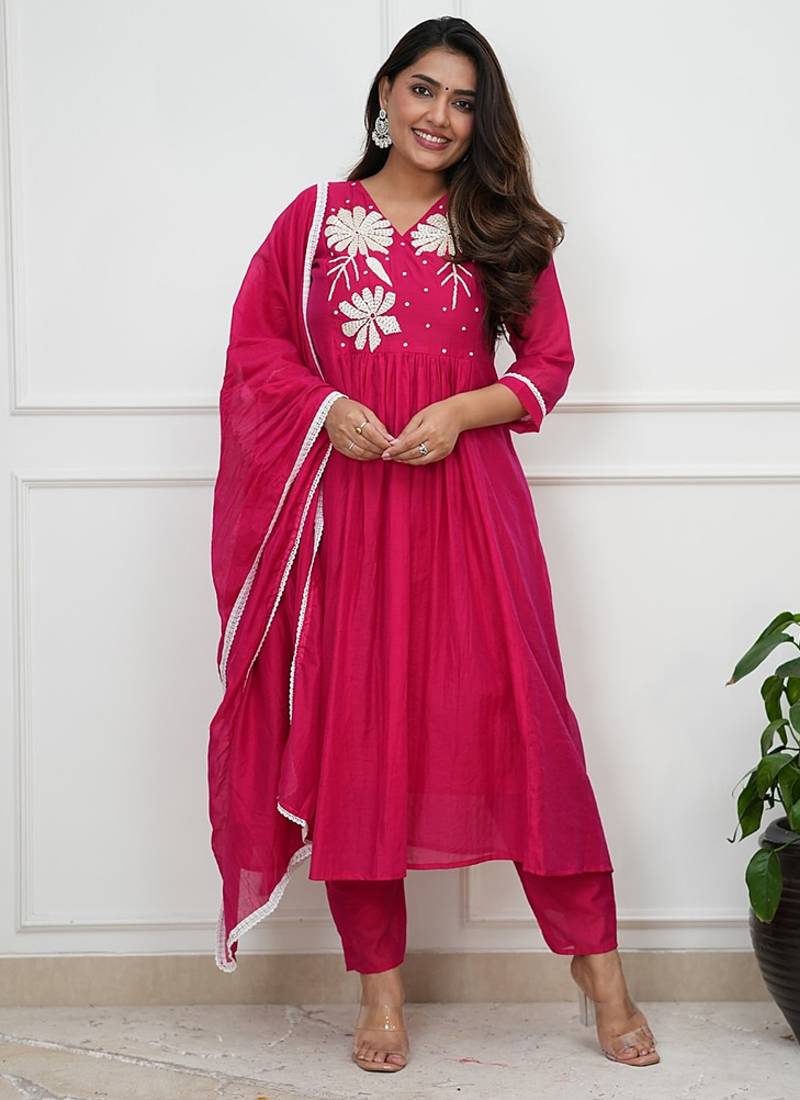 • Product Id : 4714764 • Package Details : 1 Top / 1 Bottom / 1 Dupatta • Type : Kurta Sets • Occasion : Ceremonial • Work : Embroidered • Type : Hand Embroidery • Look : Designer • Sleeve : Quarter Sleeve • Neck Style : V Neck • Color : Rani Pink • Fabric : Silk Blend • Stitching : Stitched Payments [+]