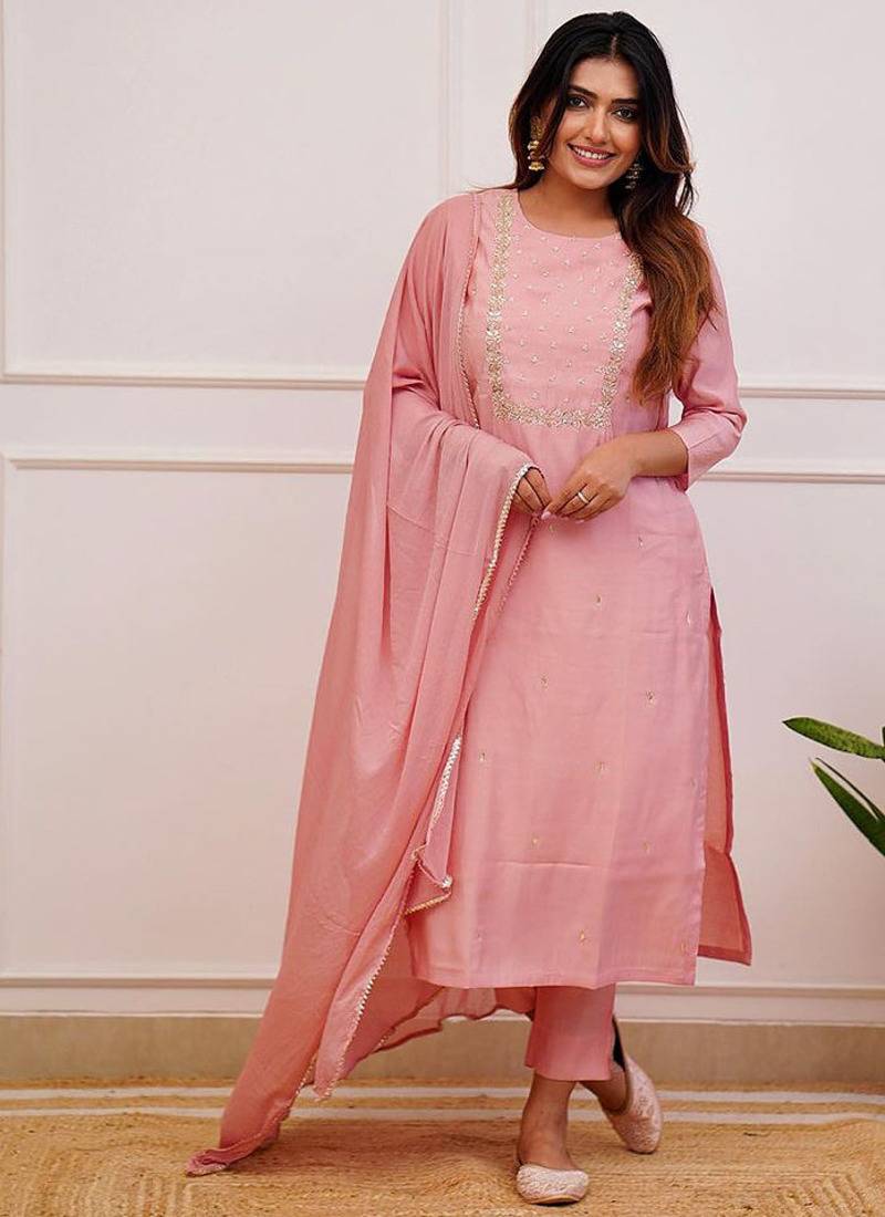 • Product Id : 4699423 • Package Details : 1 Top / 1 Bottom / 1 Dupatta • Type : Kurta Sets • Work : Embroidered • Type : Zari Work • Look : Designer • Sleeve : Elbow Sleeve • Neck Style : Round Neck • Color : Light Pink • Fabric : Faux Rayon • Stitching : Stitched Payments [+]