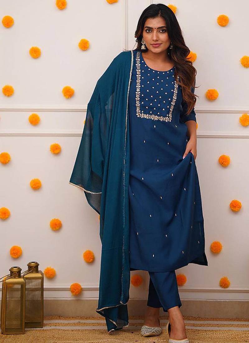 • Product Id : 4699421 • Package Details : 1 Top / 1 Bottom / 1 Dupatta • Type : Kurta Sets • Work : Embroidered • Type : Zari Work • Look : Designer • Sleeve : Elbow Sleeve • Neck Style : Round Neck • Fabric : Faux Rayon • Color : Teal Blue • Stitching : Stitched Payments [+]