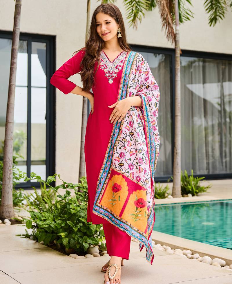 • Product Id : 4694818 • Package Details : 1 Top / 1 Bottom / 1 Dupatta • Type : Kurta Sets • Work : Embroidered • Type : Zari Work • Look : Designer • Sleeve : Elbow Sleeve • Neck Style : V Neck • Fabric : Rayon • Color : Rani Pink • Stitching : Stitched Payments [+]