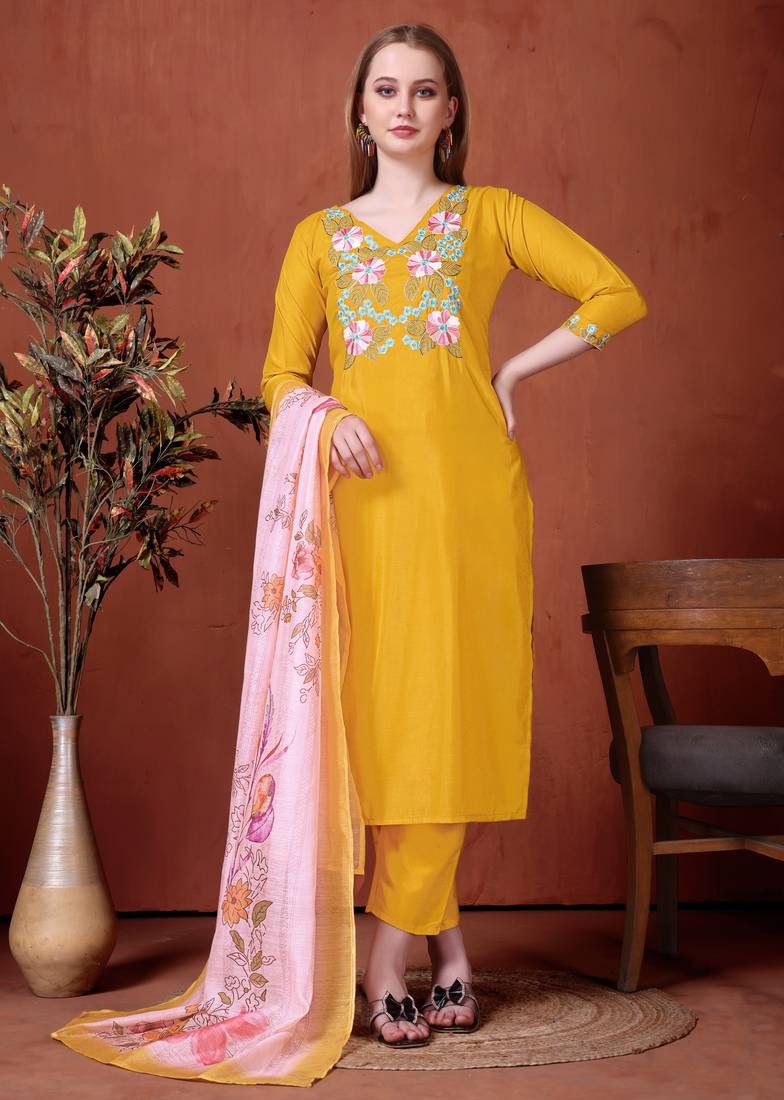 • Product Id : 4694983 • Package Details : 1 Top / 1 Bottom / 1 Dupatta • Type : Kurta Sets • Work : Embroidered • Type : Floral Print • Look : Designer • Sleeve : Elbow Sleeve • Neck Style : V Neck • Fabric : Rayon • Color : Mustard • Stitching : Stitched Payments [+]