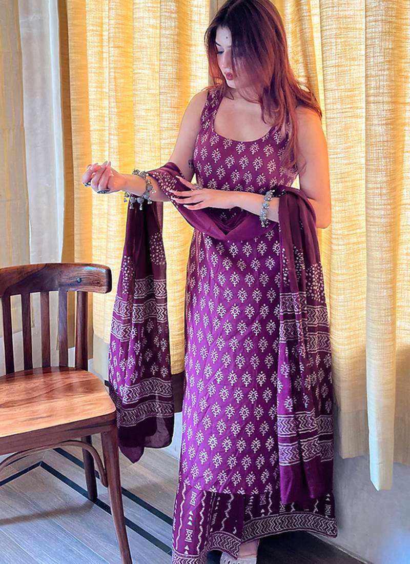 Make the heads turn the moment you dress up in this gorgeous purple rayon salwar kameez. The print work appears to be chic and perfect for casual. Comes with matching bottom and dupatta. (Slight variation in color, fabric & work is possible. Model images are only representative.)