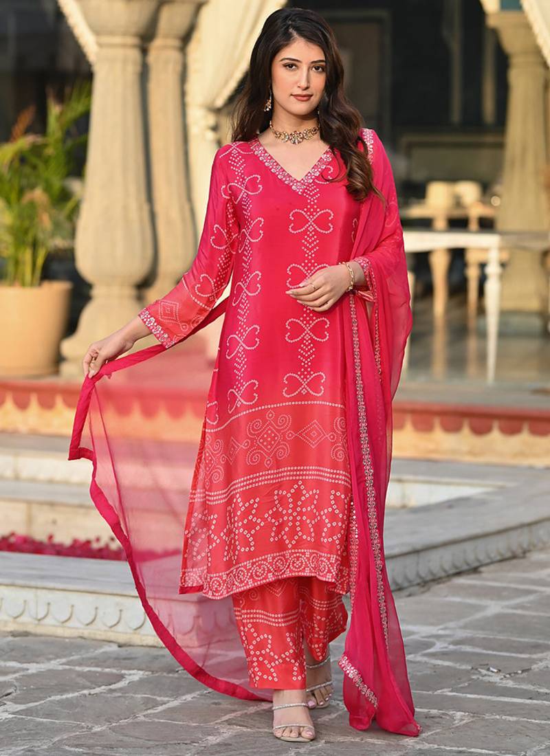 Red Color Chinon Silk Printed Kurta Set Stitched