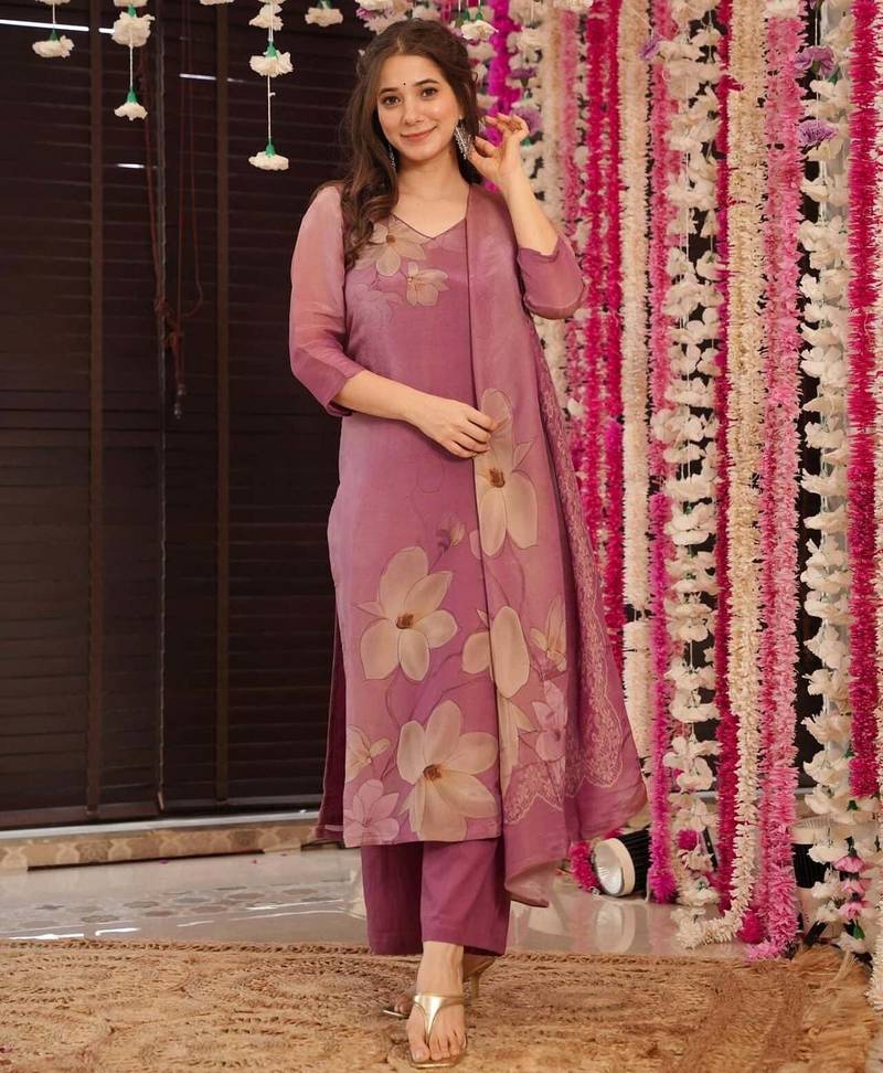 Salwar Kameez Printed Chanderi Silk In Onion Pink Stitched