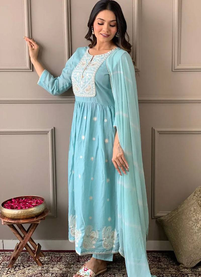 A festive Sky blue color viscose chanderi A line straight suit featuring embroidery. Styled with 3/4th sleeves, round neckline and a drawstring closure, paired with straight pants and dupatta.
