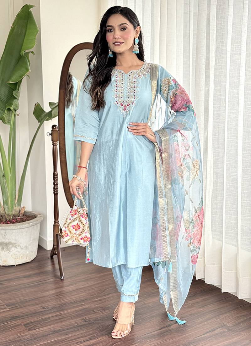 • Style : Salwar • Color : Sky Blue • Fabric : Faux Chanderi • Color : Sky Blue Dupatta Details