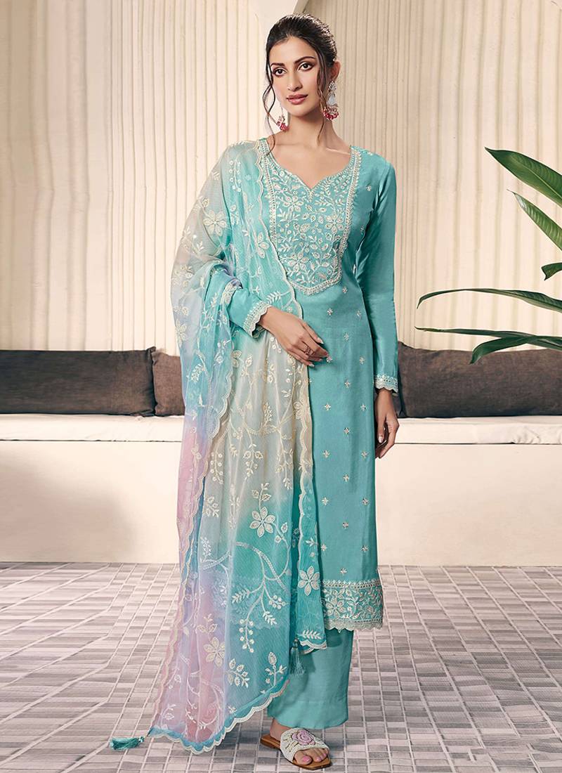 Sky Blue Color Monga Silk Embroidered Suit Semi stitched
