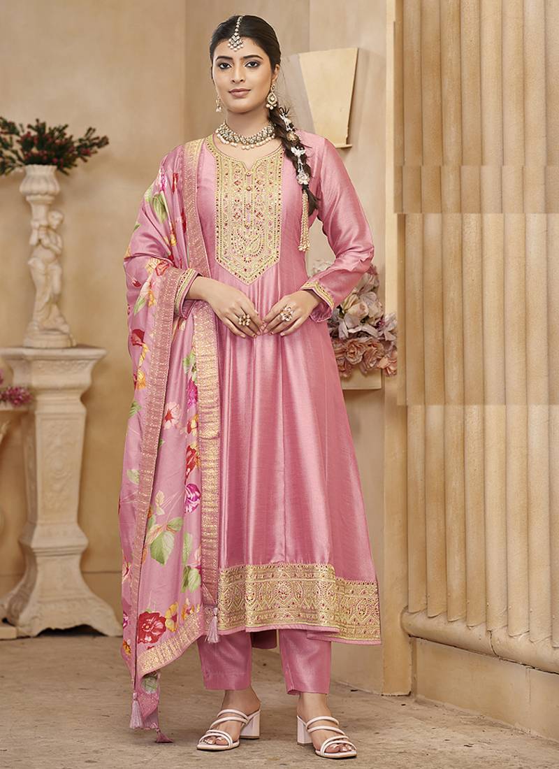 Vichitra Silk Pink Embroidered Anarkali Salwar Kameez Semi stitched
