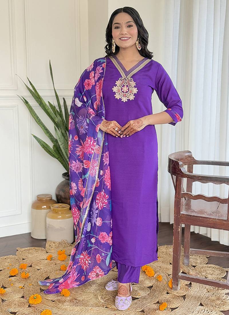 • Product Id : 4709025 • Package Details : 1 Top / 1 Bottom / 1 Dupatta • Type : Kurta Sets • Work : Embroidered • Type : Floral Print • Look : Designer • Sleeve : Quarter Sleeve • Neck Style : V Neck • Color : Violet • Fabric : Faux Chanderi • Stitching : Stitched Payments [+]