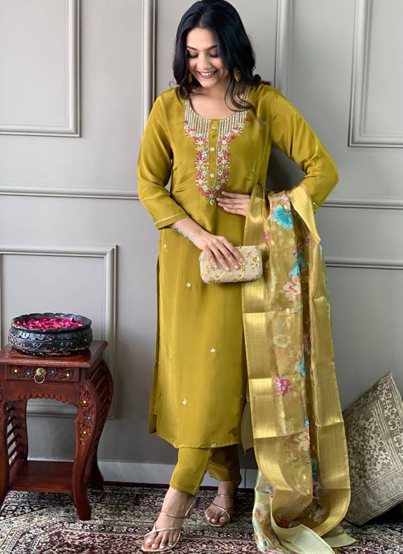 Viscose Chanderi Embroidered Readymade Suit In Olive Green Stitched