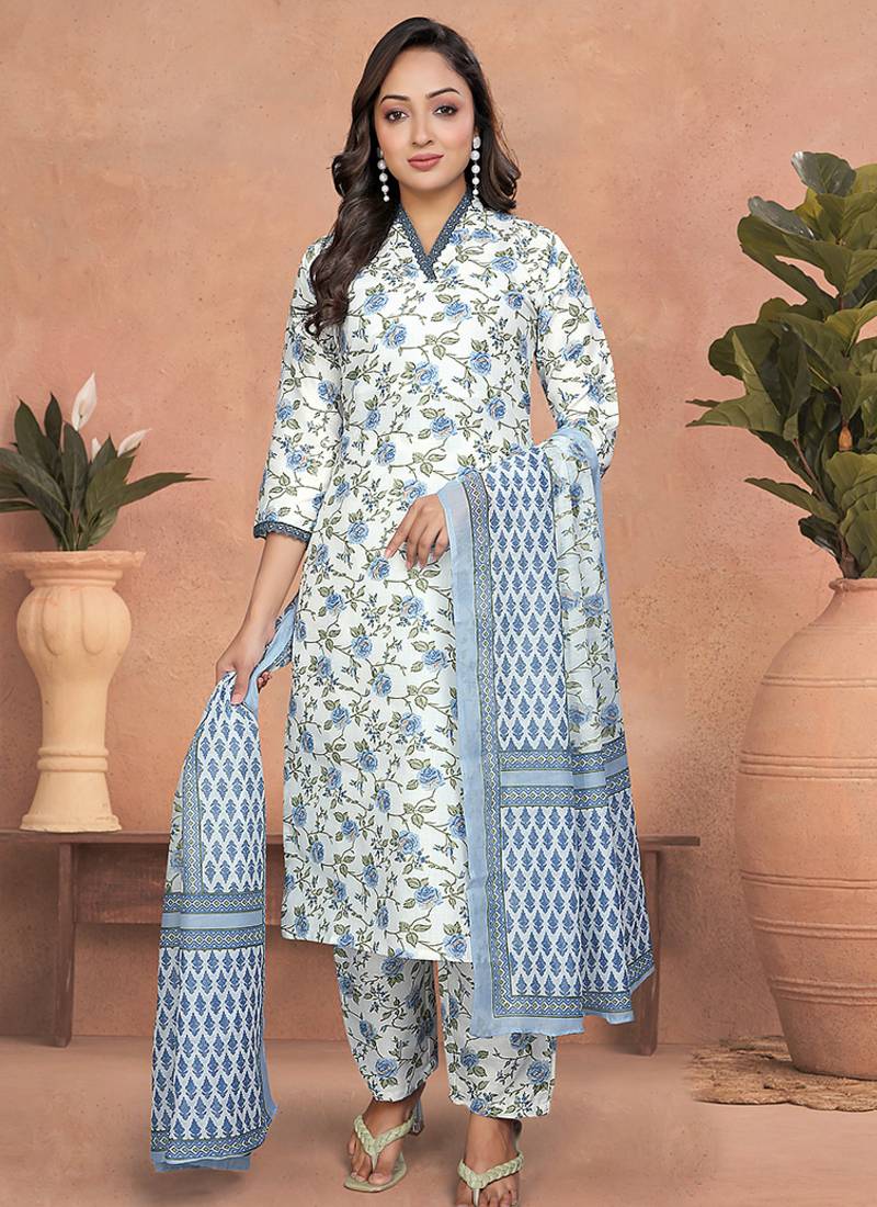 White And Blue Cotton Slub Printed Readymade Kurta Set Stitched