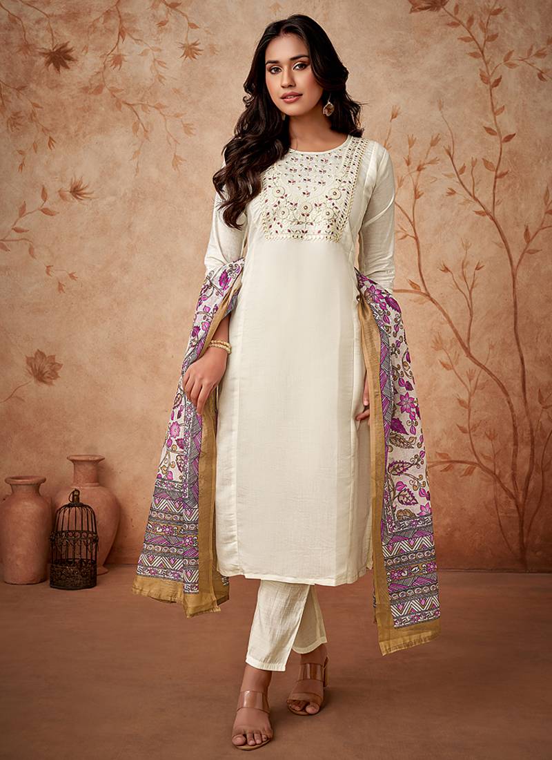 • Product Id : 4696446 • Package Details : 1 Top / 1 Bottom / 1 Dupatta • Type : Kurta Sets • Work : Embroidered • Type : Floral Print • Look : Designer • Sleeve : Elbow Sleeve • Neck Style : Round Neck • Color : White • Fabric : Faux Chanderi • Stitching : Stitched Payments [+]