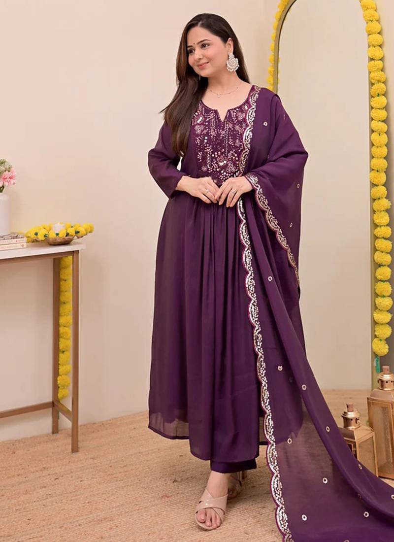 Wine Chanderi Silk Embroidered Anarkali Suit Stitched