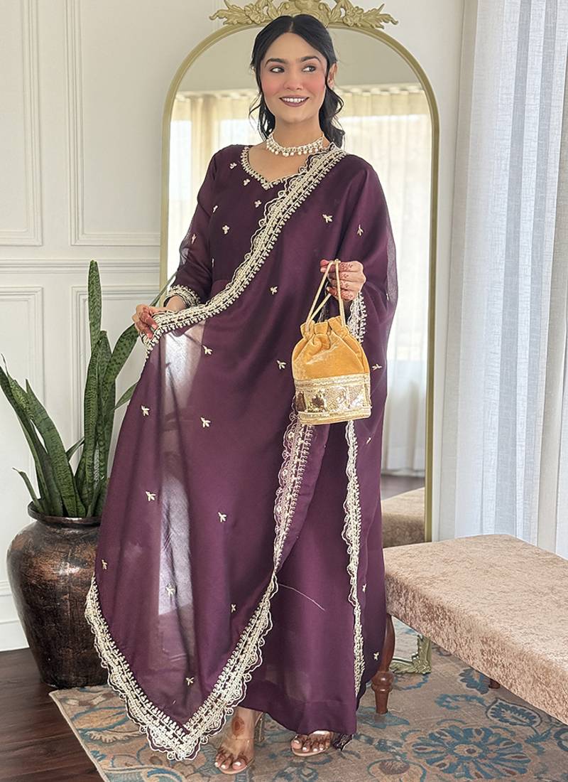When you want pattern to lead without heavy layers, this wine color vichitra silk anarkali suit delivers airy drape and vivid craft. wedding-style motifs flow across the silhouette, keeping the outfit striking yet simple to wear. You feel elegant, festive and perfectly set for Pooja and seasonal gatherings.