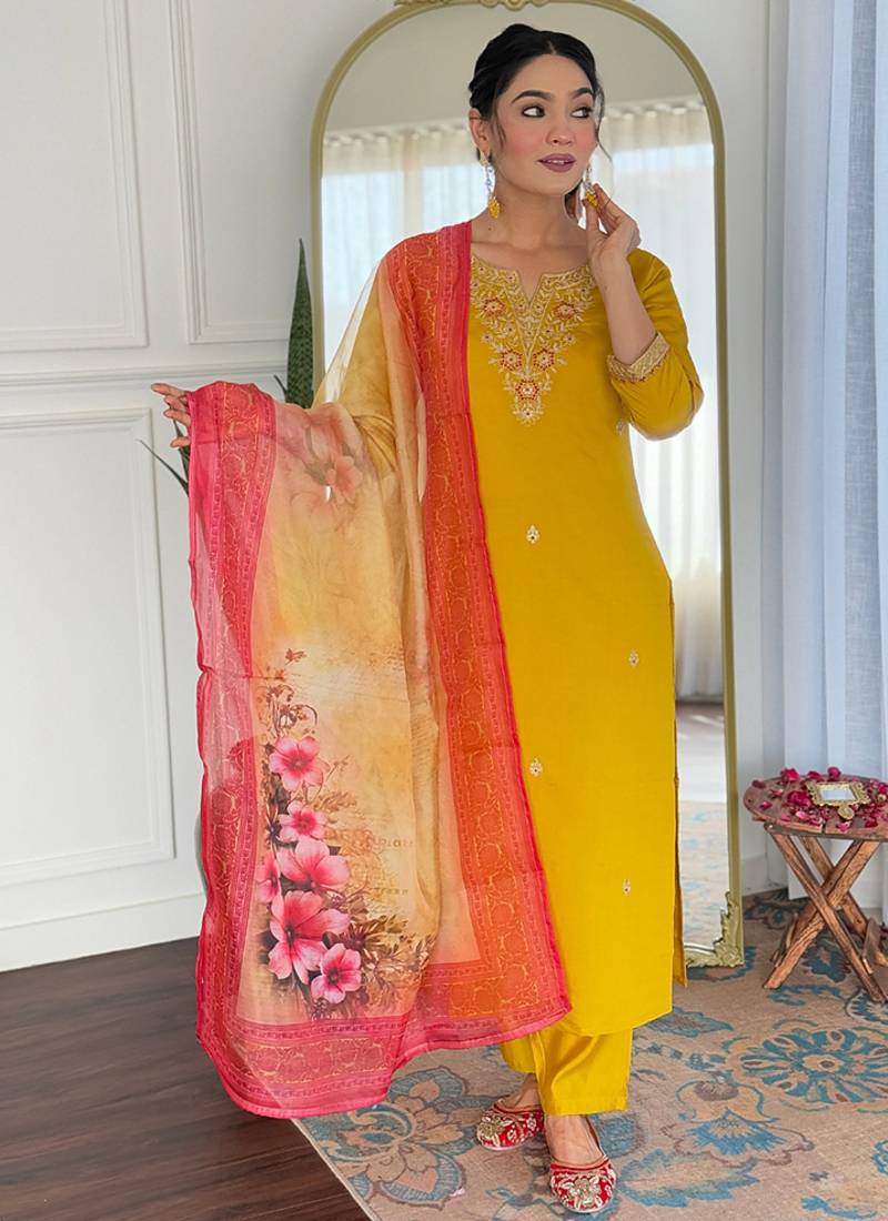 • Product Id : 4705982 • Package Details : 1 Top / 1 Bottom / 1 Dupatta • Type : Kurta Sets • Work : Embroidered • Type : Floral Print • Look : Designer • Sleeve : Quarter Sleeve • Neck Style : Keyhole Neck Kameez • Color : Yellow • Fabric : Faux Rayon • Stitching : Stitched Payments [+]