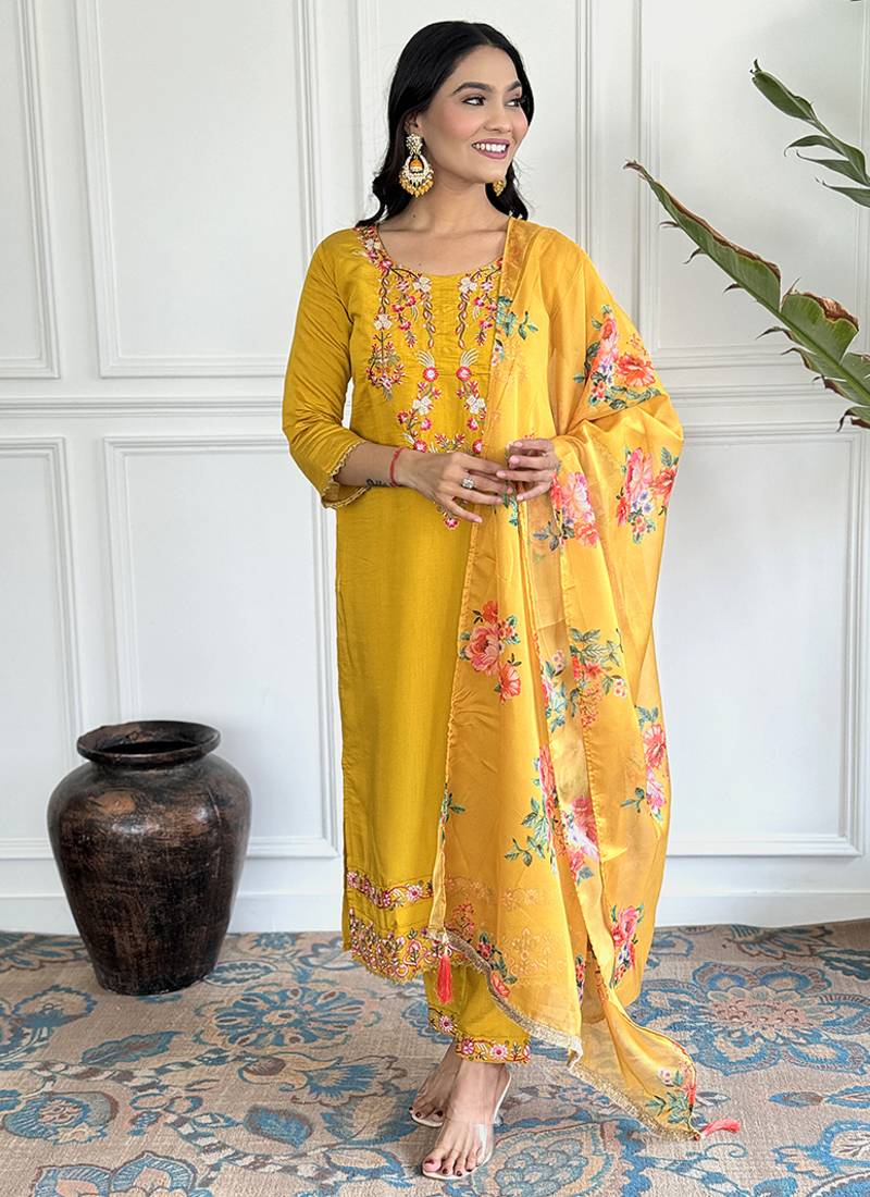 Yellow Color Chanderi Embroidered Straight Suit Stitched
