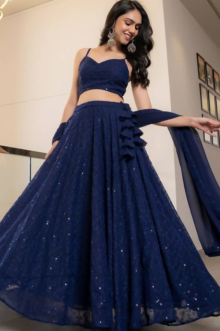 • Style : A Line Lehenga • Fabric : Georgette • Work : Embroidered • Color : Navy Blue Dupatta Details