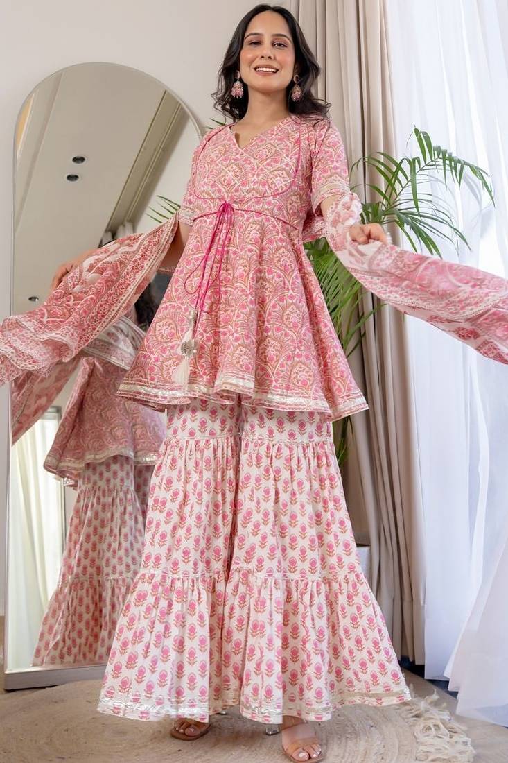 • Product Id : 4679144 • Package Details : 1 Kurta / 1 Sharara / 1 Dupatta • Type : Kurta Sets • Fabric : Cotton • Work : Printed • Type : Floral Print • Sleeve : Half Sleeve • Neck Style : V Neck • Color : Pink • Stitching : Stitched • Length : 30.0 Payments [+]