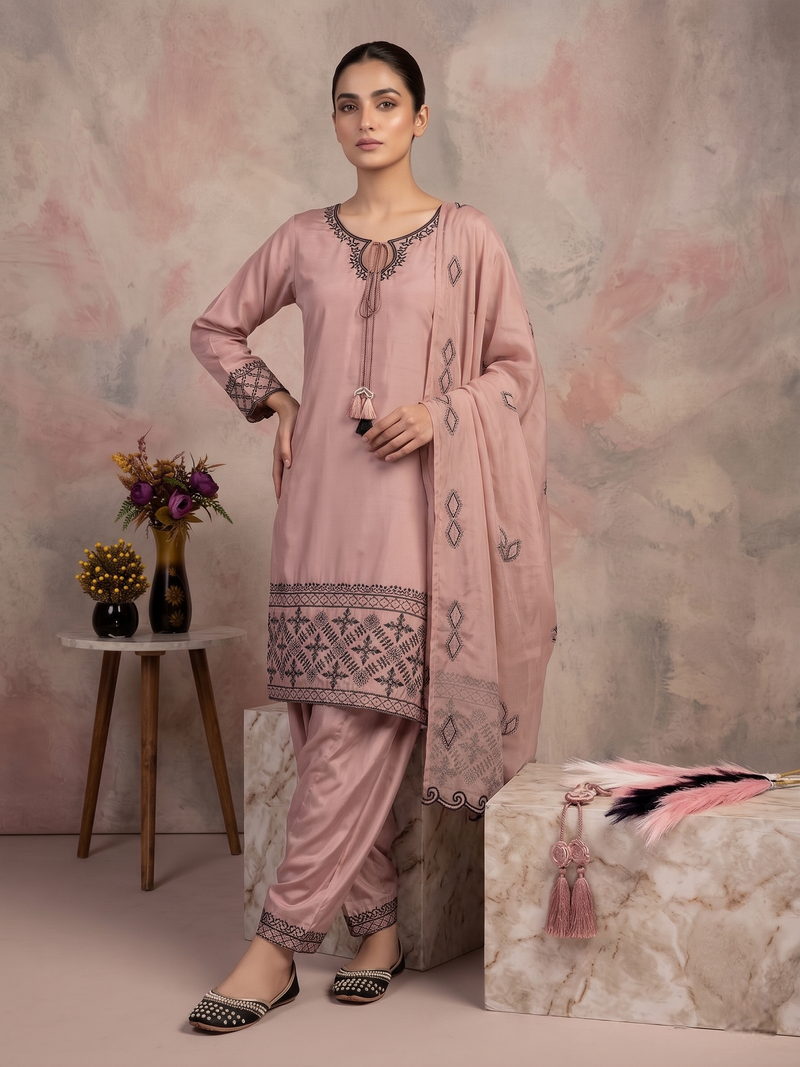 Elegant Blush Pink Embroidered Kurta Set With Farshi Salwar Stitched