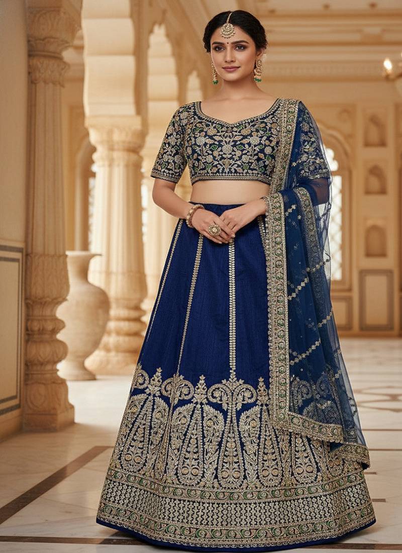 Navy Blue Slub Silk Embroidered Lehenga Set With Dupatta