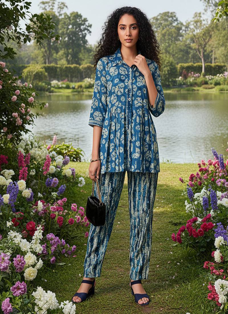 • Product Id : 4690445 • Package Details : 1 Top /1:Bottom /1:Scarf • Type : Co Ord Sets • Fabric : Crepe • Work : Printed • Type : Geometric Print • Sleeve : Full Sleeve • Color : Blue • Stitching : Stitched • Length : Knee Length • Length : Knee Length Payments [+]