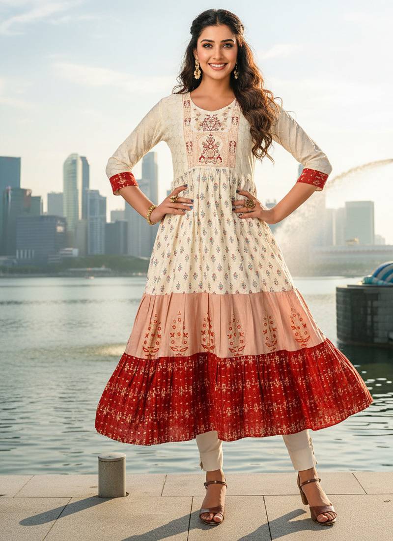 Cream Cotton With Hand Print Light Embroidered Kurti