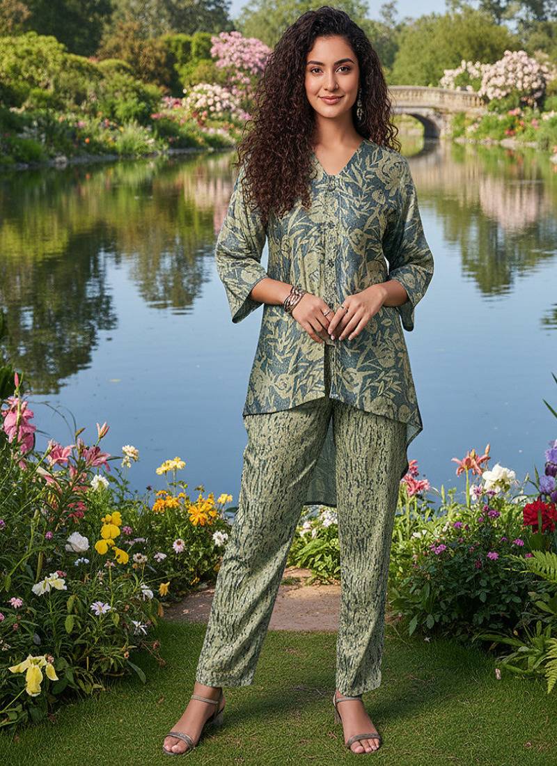 • Product Id : 4690441 • Package Details : 1 Top /1:Bottom /1:Scarf • Type : Co Ord Sets • Fabric : Crepe • Work : Printed • Type : Geometric Print • Sleeve : Full Sleeve • Color : Green • Stitching : Stitched • Length : Knee Length Payments [+]