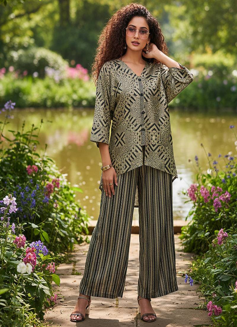 • Product Id : 4690450 • Package Details : 1 Top /1:Bottom /1:Scarf • Type : Co Ord Sets • Fabric : Crepe • Work : Printed • Type : Geometric Print • Sleeve : Full Sleeve • Color : Grey • Stitching : Stitched • Length : Knee Length • Length : Knee Length Payments [+]