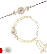 Raksha Bandhan is popular traditional Indian Festival. On this day, sisters of all ages tie a talisman, or amulet, called the rakhi, around the wrists of their brothers, symbolically protecting them, receiving a gift in return, and traditionally investing the brothers with a share of the responsibility of their potential care. The festival is also called as Rakhi Poornima, Nariyal Poornima and Kajari Poornima in different states and is celebrated differently. In short, Raksha Bandhan symbolizes the unmatched bond of love, care and respect. This thoughtful combo set also includes traditional Roli Chawal for the auspicious ceremony, adding a touch of tradition and symbolism to the Rakshabandhan festivities. Additionally, it comes with a beautifully designed Rakshabandhan Greeting Card, perfect for expressing heartfelt sentiments and well wishes to your beloved brother and sister-in-law. Whether you're near or far, this Designer Kundan Pearl Hanging Bhaiya Bhabhi Lumba Rakhi Bracelet Combo Set is the perfect way to convey your love and blessings on Rakshabandhan, creating cherished memories that will last a lifetime.