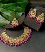 The gold-plated choker necklace set consists of a necklace, a pair of earrings, and a maang tikka. The necklace features kundan studded with pearl beaded in it, giving it an elegant and traditional look. The stones and pearls are set in a beautiful pattern, adding a touch of sophistication and grace to the necklace. The necklace is secured with drawstring closures, which make it easy to adjust the size to fit comfortably around the neck. This is an important feature, as it ensures that the necklace will be comfortable to wear for extended periods of time. The necklace is secured with drawstring closures, which make it easy to adjust the size to fit comfortably around the neck. This is an important feature, as it ensures that the necklace will be comfortable to wear for extended periods of time. The earrings and maang tikka are also adorned with stones and pearls, which match the pattern of the necklace. The earrings have a beautiful design, which makes them easy and comfortable to wear. The maang tikka is a traditional Indian hair accessory that can be worn with the necklace and earrings to complete the look.