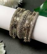 Add a touch of timeless elegance to your Navratri ensemble with this traditional silver oxidized bangle set. This bangles features exquisite craftsmanship, with intricate designs that reflect the rich heritage of Indian jewelry. The oxidized silver finish gives these bangles a classic, antique appeal, making them a perfect accessory to complement your festive attire. Whether paired with a saree, lehenga, or salwar kameez, these bangles are designed to enhance your ethnic look with grace and sophistication.