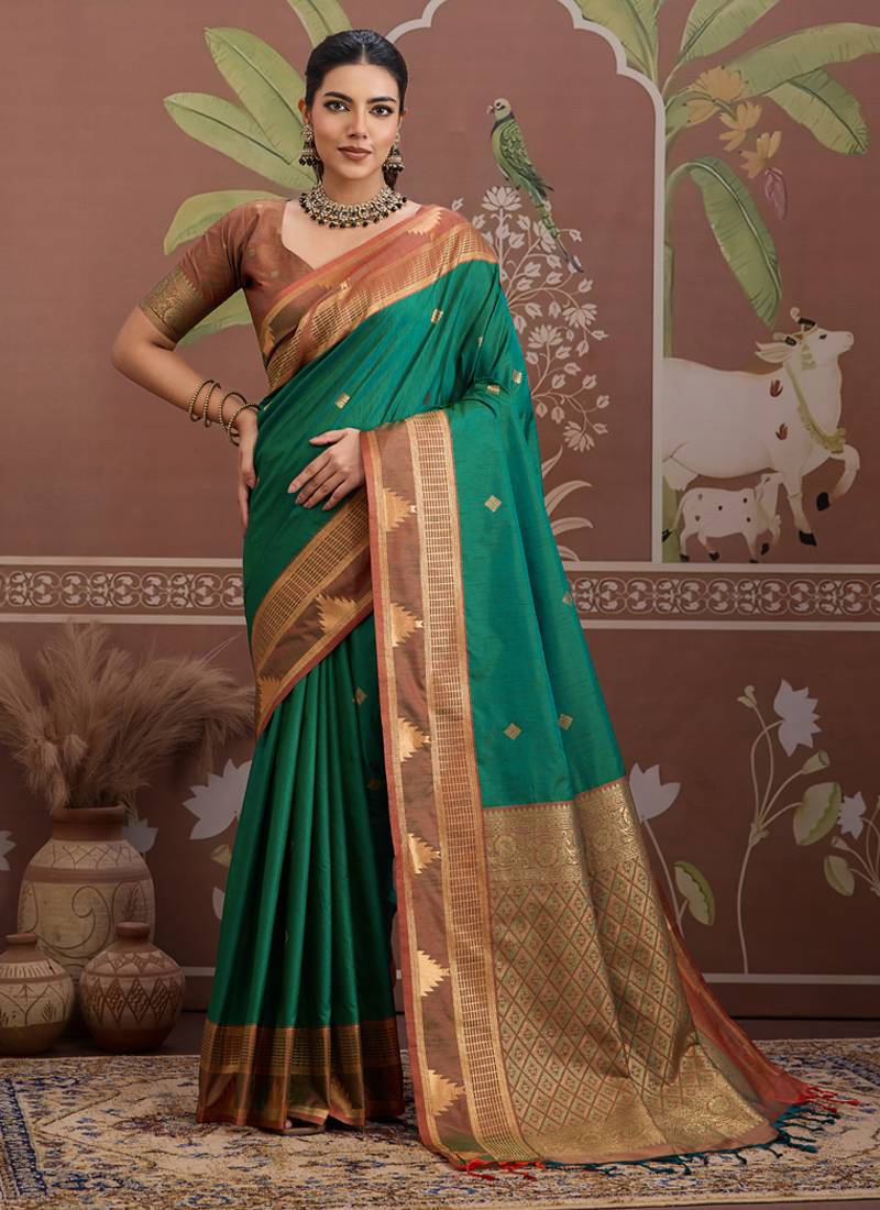 Green Tussar Silk Handloom Weaving Temple Border Saree