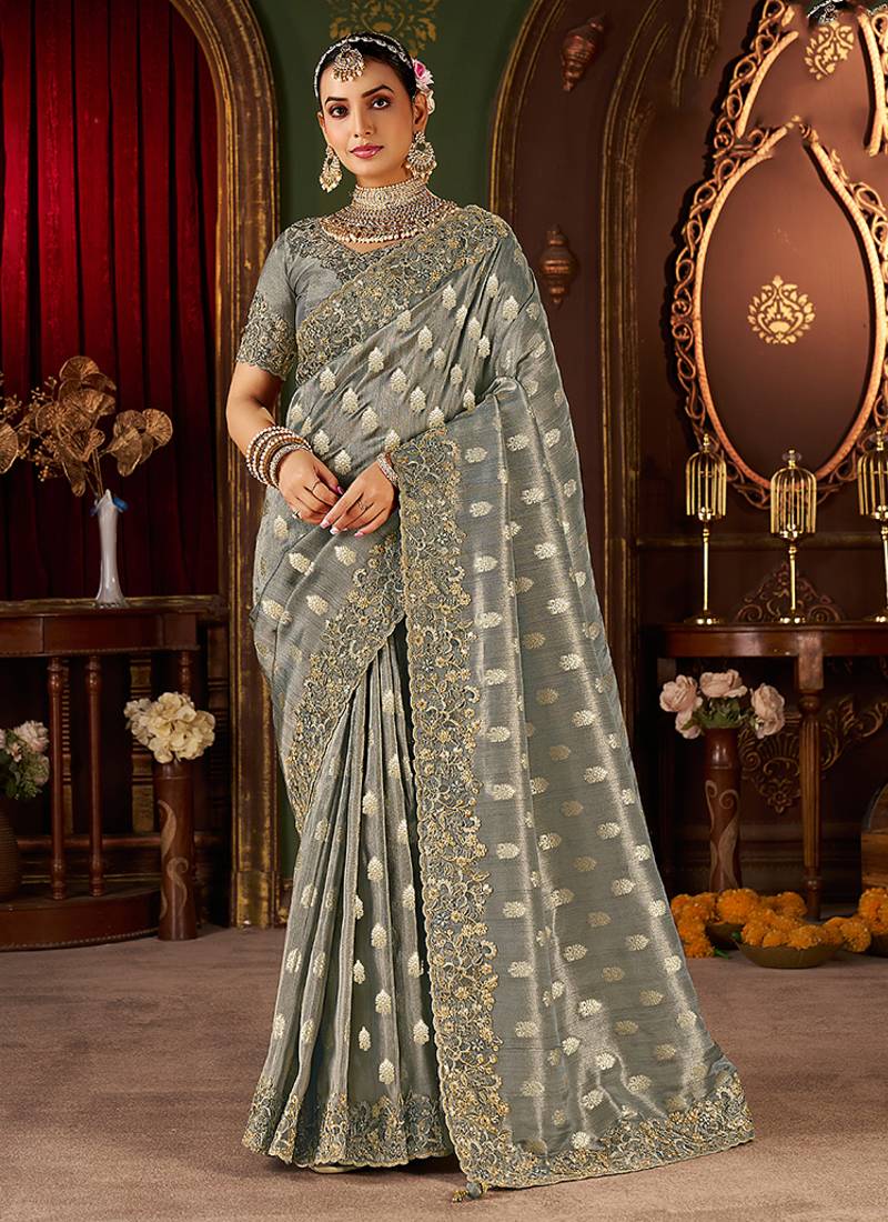 Grey Pure Viscose Tissue Jaqurad Anmol Zari Saree