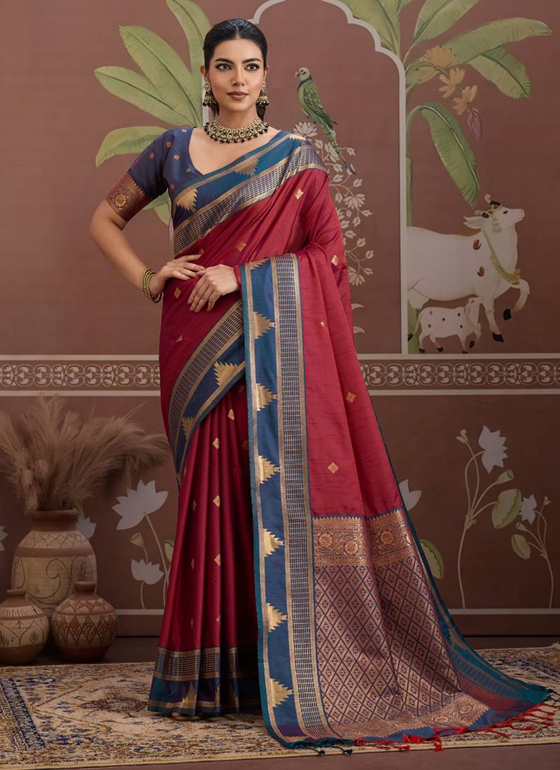 Maroon Tussar Silk Handloom Weaving Temple Border Saree