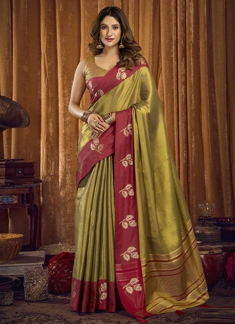 • Saree : Color- Olive / Fabric- Tissue • Blouse : Color- Golden / Fabric- Tissue Saree Details