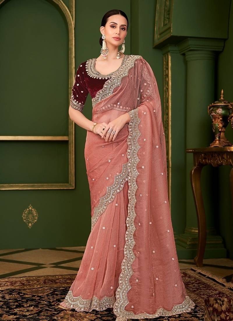 • Saree : Color- Peach / Fabric- Viscose • Blouse : Color- Maroon / Fabric- Velvet Saree Details