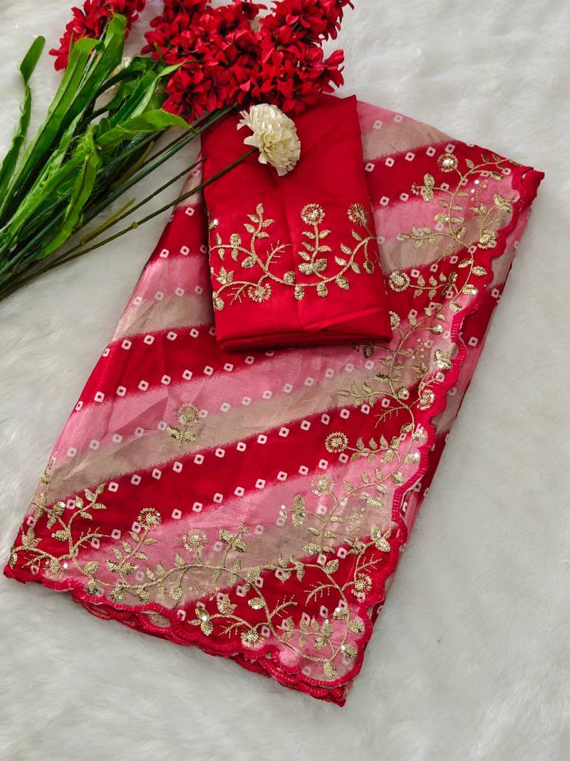 Chiffon Lehriya Bandhani Design Saree With Heavy Thread & Sequins Work