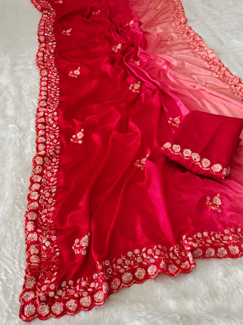 Elegant Red Chiffon Saree With Heavy Designer Sequins & Thread Work And Silk Blend Blend Blouse